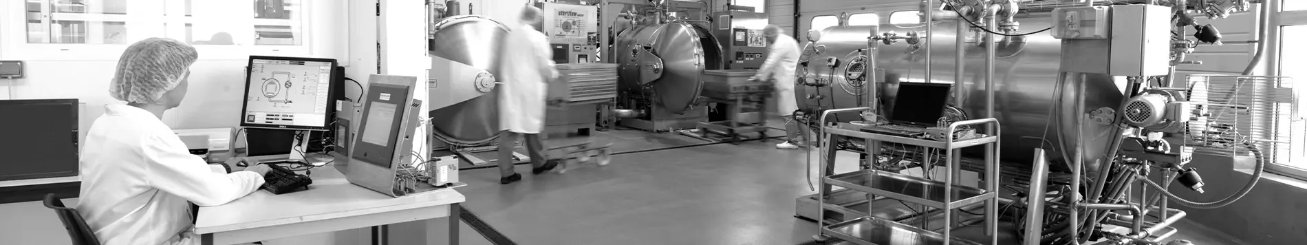 Nous disposons d’un hall pilote au coeur de notre usine de Roanne équipé d’autoclaves pilotes (statique, rotatif, agitation douce et Shaka) ainsi que d’un espace dédié à la préparation des produits.